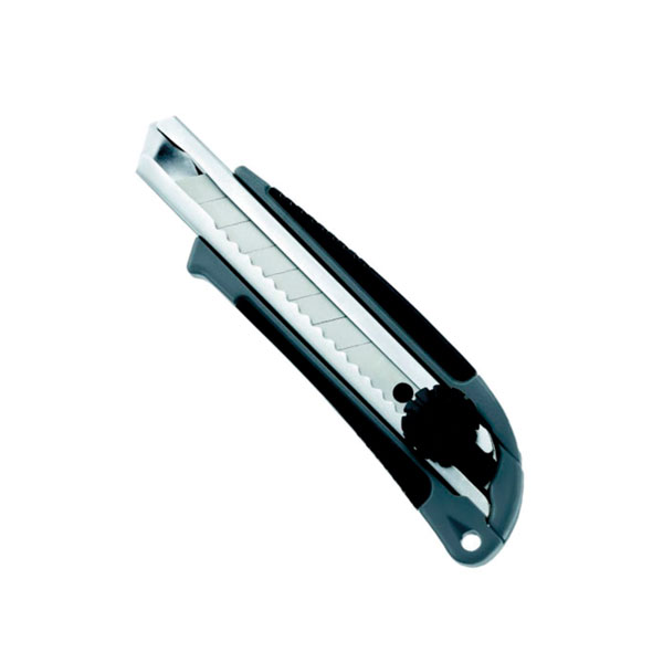 Met rubberen antisliphandgreep en stelschroef. Metalen mesblad van 18 mm. Mesvergrendelingssysteem