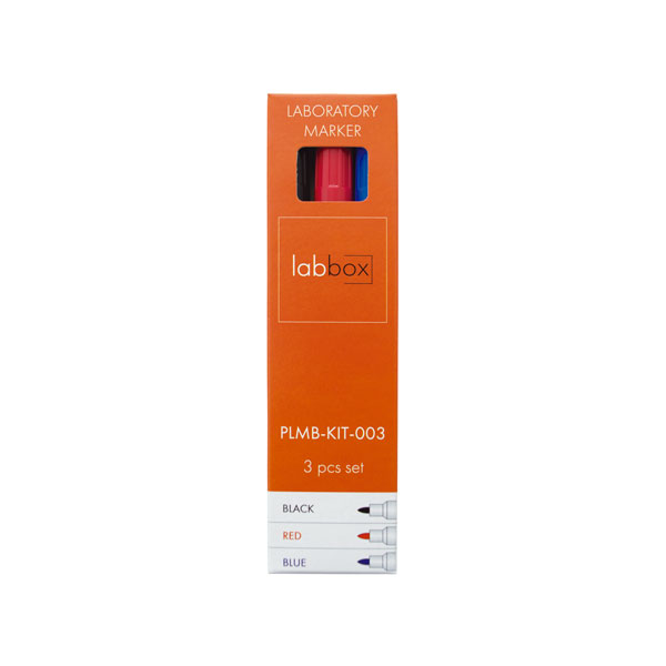 Voor de speciale vereisten van het laboratorium. Set van drie markeerstiften met drie verschillende kleuren: zwart, blauw en rood. Ronde punt. Speciaal ontworpen voor oppervlakken van laboratoriumapparatuur zoals objectglazen, glazen recipiënten, laboratoriuminstrumenten en etiketten. Zeer goed bestand tegen tegen alcohol (kan alleen worden uitgewist door stevig wrijven) en water, maar uitwisbaar met aceton en xyleen